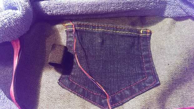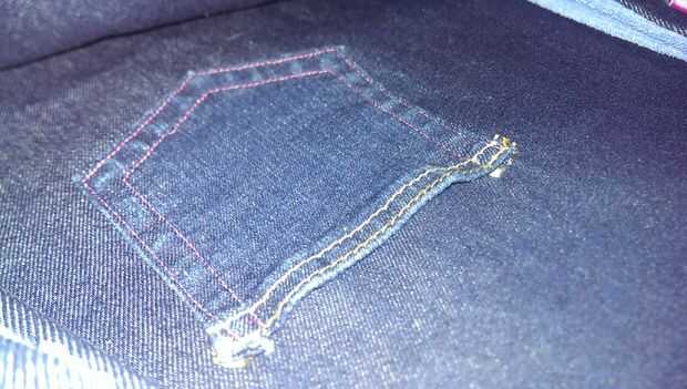 Dos bolsillos de denim fueron unpicked de ropa vieja y cosido en, uno para el usuario de la bolsa de uso, uno para el chip debajo de la aleta del servicio.