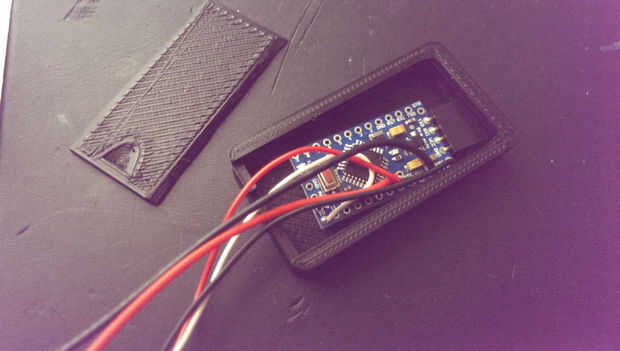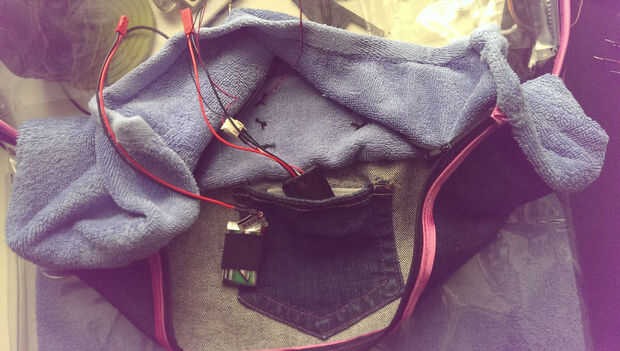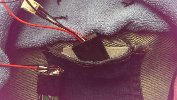 El Arduino y LiPo batería de residir en un zip "aleta estrecha de servicio" en el interior de la bolsa.