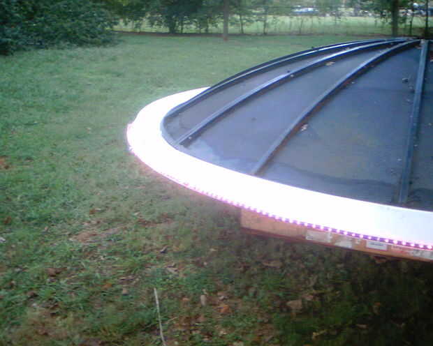 sabía que el platillo se va a necesitar cierta iluminación para ser visto por la noche, así que lo primero que pensé necesitaba era algún iluminación de cuerda alrededor del perímetro para definir su forma. Pienso montar unos ganchos de copa sobre cada tres pies para colgar la luz de la cuerda a. Utilicé dos secciones de 18' luz de cuerda de color púrpura, que circundó el perímetro exterior del platillo casi a la perfección! Tenía tal vez un pie izquierdo, que apenas superpuestas en la parte "posterior". La luz tenía una tendencia a decaer un poco entre ganchos, por lo que he añadido algunas secciones de la cinta de montaje doble cara en el medio para mantener la luz en línea recta.