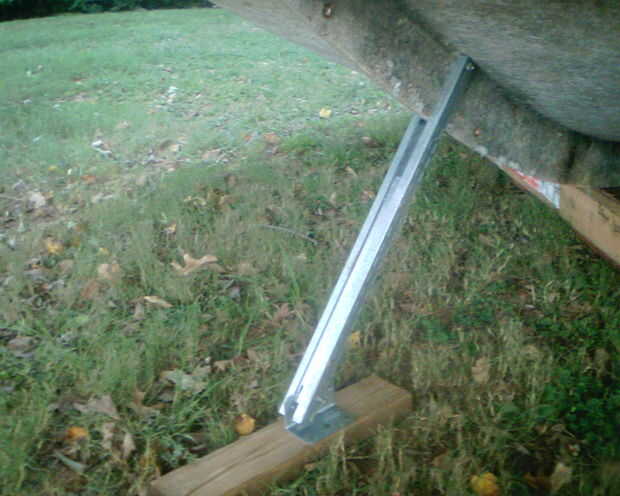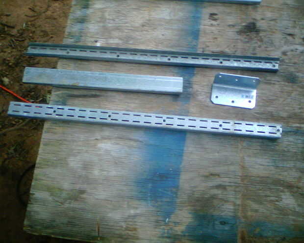 ¿Qué platillo es capaz de aterrizar en la superficie de un mundo sin trenes de aterrizaje? No responder a eso, porque probablemente alguien sabe! jajaja de todos modos, para realizar este paso, cavé en mis reservas de desechos de guardado de materiales. En mi trabajo utilizamos una pieza de metal llamada una 'vertical'. Es un canal ranurado de metal usado para el montaje de estanterías a una góndola en las tiendas. Generalmente terminamos cortando a la medida, que deja una buena parte a la izquierda que es demasiado corta para usar. Por lo tanto, emparejado dos piezas de 24" de longitud para cada etapa, junto con 15" pedazo de pista de la puerta de un cobertizo de almacenamiento desmanteladas y el ángulo de una esquina del 'Depósito'. He utilizado la melodía como un espaciador entre los montantes, que los colocó aparte la cantidad correcta a las bridas bajo el plato de fibra de vidrio. Yo corte una ranura en el borde inferior de la pista con mi amoladora de ángulo para permitir que el ángulo de la esquina se deslice hasta allí un poco. Taladré orificios a través de los montantes en la parte inferior para fijar el ángulo de la esquina entre ellos. Ver el resultado final en la segunda foto. Al principio, utilicé trozos de chatarra de 2x4s para las pastillas, pero substituyó más adelante con algunos canal rescatado de la nave.
