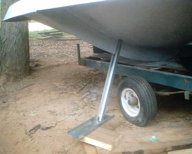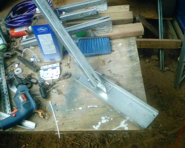 Como he dicho antes, no estaba feliz con el uso de 2x4s para las almohadillas de los trenes de aterrizaje, así que reemplacé con canal de metal del armazón rescatado del techo de un cobertizo de almacenamiento de información. Mucho mejor! Medido hacia fuera para que el ángulo de la esquina establecería centrada en el canal y utiliza tornillos de 1/4 "x 20 para montar. Entonces sujeté los engranajes para las bridas bajo el platillo, colocarlos en un punto cerca de un tercio del camino desde el exterior y quitar el montaje existente del tornillo para fijar el engranaje. Nota: Es muy conveniente que los platos de fibra de vidrio tienen unos 18 tornillos a lo largo de cada pestaña, así que usted puede escoger alguno de los agujeros correspondientes con el fin de conectar cualquier accesorio que desee.