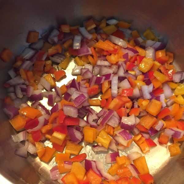 Colocar una olla de sopa del cuarto de galón de 6 a 8 a fuego medio y agregar el aceite. Dejar calentar, agregar la cebolla y los pimientos y saltear unos 5 minutos. Luego agregue el ajo y continuar a saltear.
