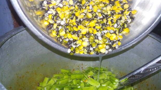En una sartén añadir abundante cantidad de agua para cocer los granos del racimo y dhokli.