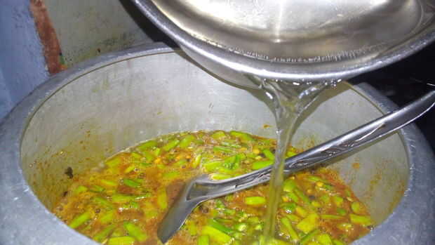 En una cacerola caliente el aceite añadir comino y semillas de mostaza y al crujido agregue el cluster frijoles y mezcla dhokli.