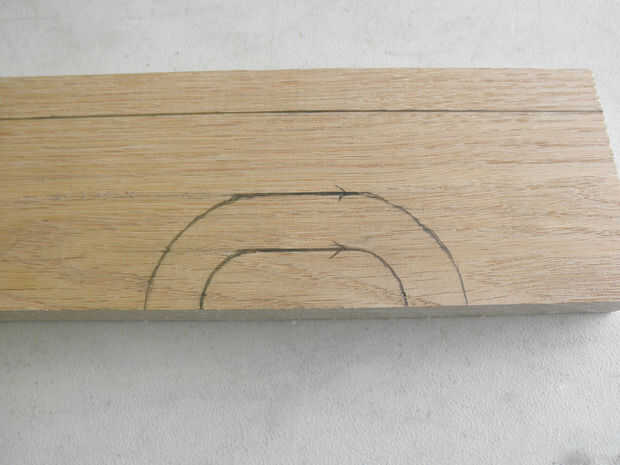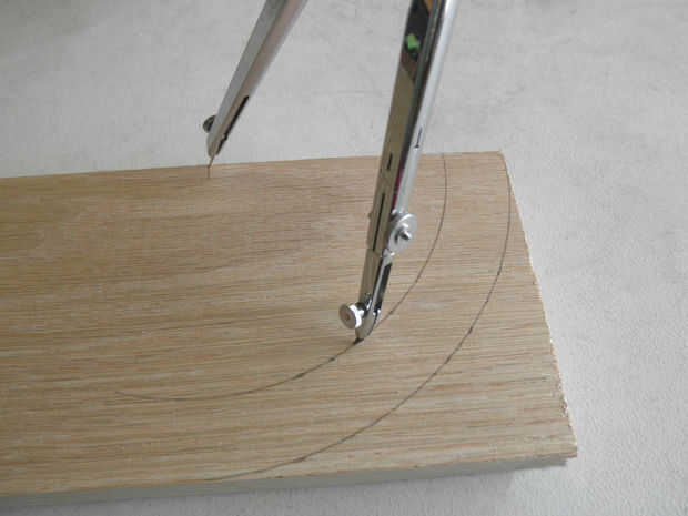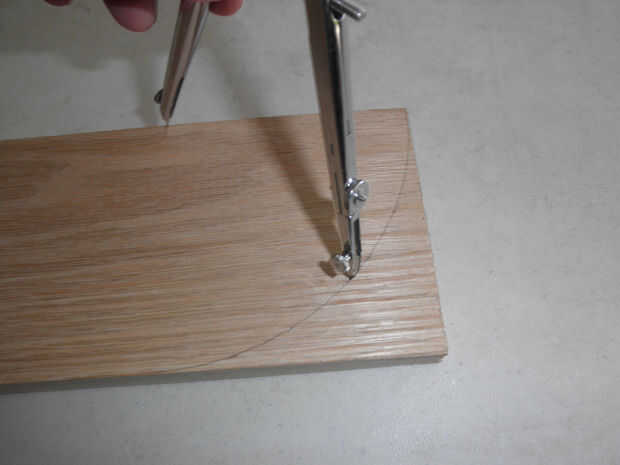 Para el mango, coloque el radio de la curva grande en un extremo de la tabla. Si no tienes acceso a un compás para hacer esto, simplemente marcar un punto 3-1/2" del extremo de la tabla, sostenga un trozo de cuerda en la marca y el otro extremo de la cuerda en la esquina con el lápiz luego del oscilación del arco. Que el lápiz en 3/4" en la cadena y el interior del oscilación arco. Luego trazar una línea recta 3/4" desde el borde la longitud de la Junta para cubrir el interior arco.