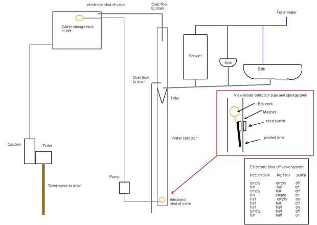 El principio básico es cuando el agua va abajo el agujero del tapón en la pileta baño ducha o baño. Se recoge en 2 tubos de suelo fijo para el lado de la casa y entonces bombeada para arriba en el desván que se almacena en un tanque de almacenamiento listo para usarse para limpiar el inodoro.