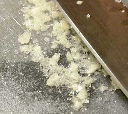Espolvorear una pequeña cantidad de sal gruesa, tales como kosher y una vez más usando el lado plano de la cuchilla, frotar todo el ajo con la sal para romper en trozos más pequeños. Si usted cuenta la sal de tu receta, no corre el riesgo de hacer algo demasiado salado para comer.