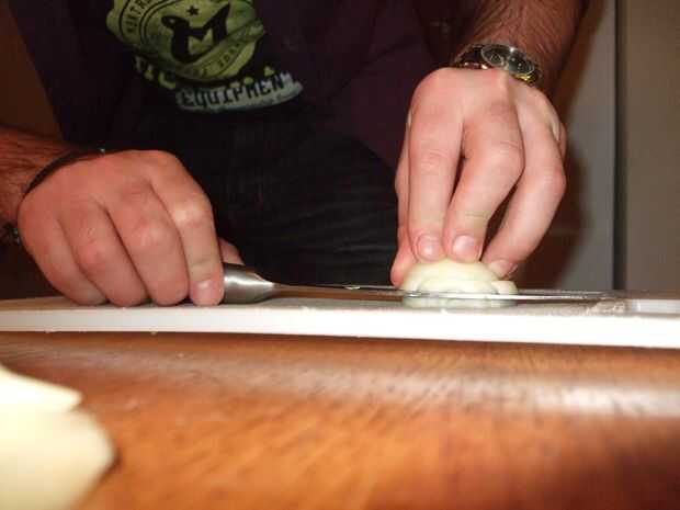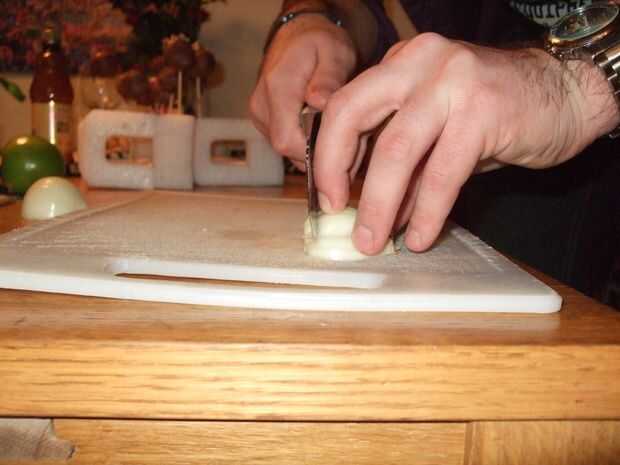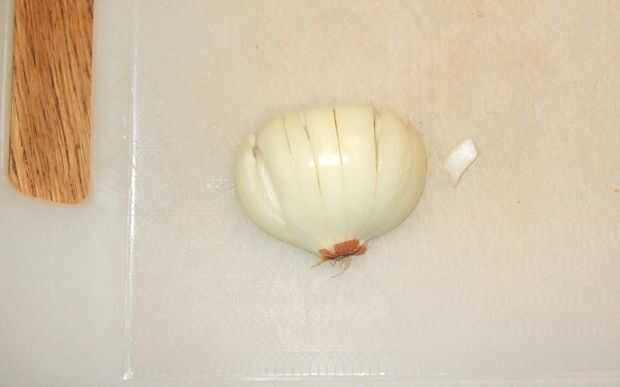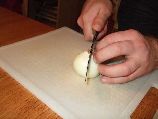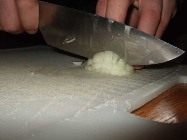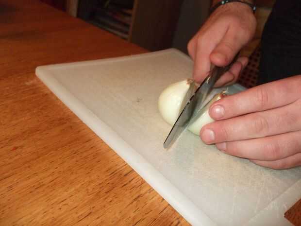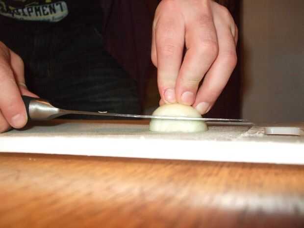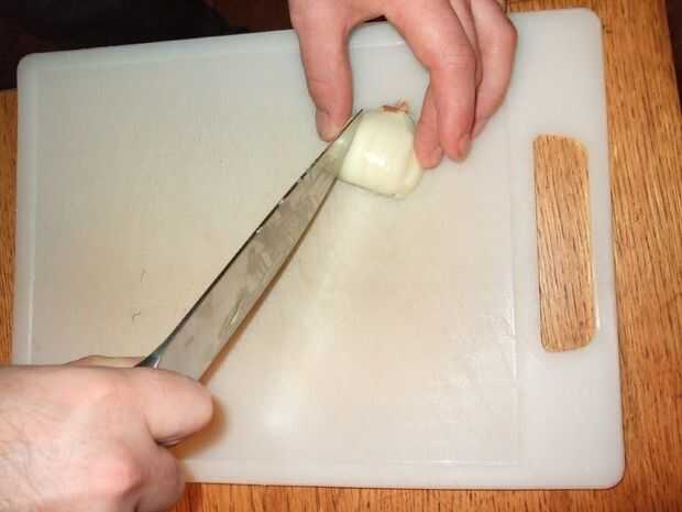 -Cortar la cebolla a la tabla para picar con la punta del cuchillo apuntando hacia la raíz, ello a lo largo de la cebolla uniformemente, como se muestra en fotos 5,6 y 7.