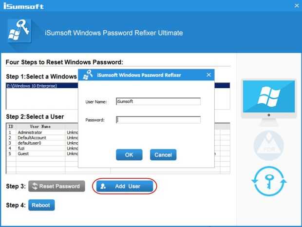 Después de ordenador arranca para arriba, aparecerá la pantalla de Windows contraseña Refixer . Haga clic en Agregar usuario, escriba un nombre y una contraseña (opcional) para agregar una nueva cuenta de administrador en el equipo.