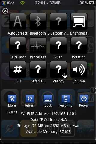 2.1: [iPod/iPhone: forma "SBSettings"] Si tienes SBSettings instalado, deslice el dedo por la barra de estado, y verá su "dirección IP de la conexión Wi-Fi". Utilícelo también como el "servidor" del espectador. Volver al ordenador.
