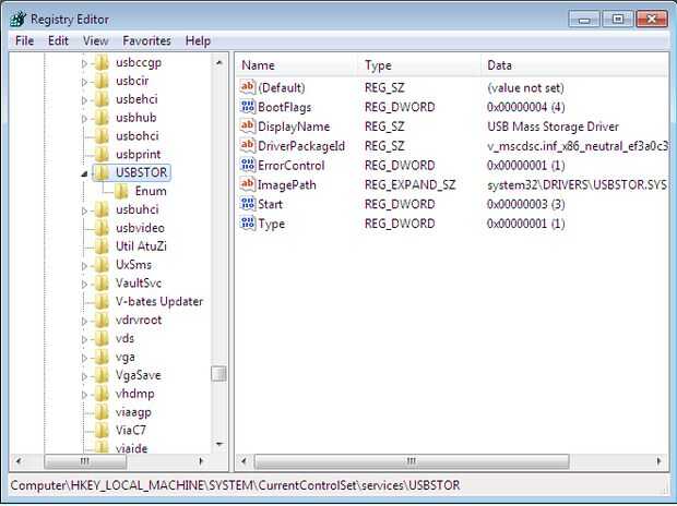 Desplácese hasta HKEY_LOCAL_MACHINE\SYSTEM\CurrentControlSet\Services\USBSTOR