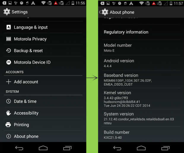 Aunque este paso es universal en todos los teléfonos Android, puede variar el lugar donde usted puede encontrar los números de compilación. Para la Moto E estamos utilizando para demo y stock más teléfonos Android, es en ajustes -> Acerca de teléfono - > número de construir. Aquí está una lista de maneras de encontrar el número de compilación para otros teléfonos: