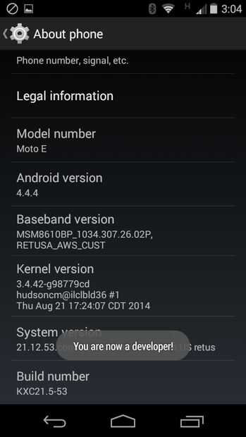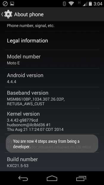 Ahora encontrar la sección 'número de compilación' en la parte inferior. Comience haciendo clic en el número de compilación. Debe aparecer un mensaje diciendo cuántos clics que está lejos de lo que permite opciones de desarrollador. Seguir haciendo clic hasta que vea el mensaje que dice que usted es ahora un desarrollador. Ahora han habilitado opciones de desarrollador!