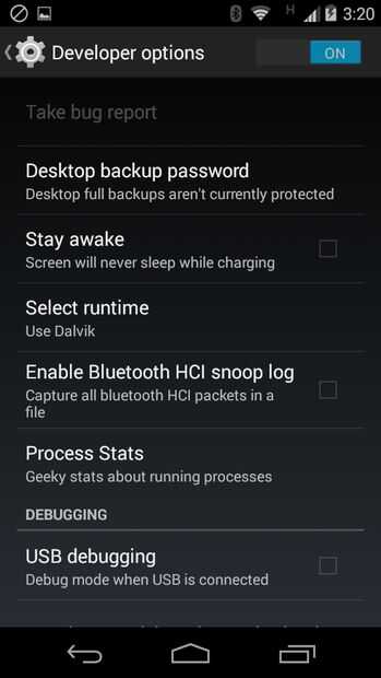 Opciones de Desarrollador en su mayoría son inútiles. No hay mucho que necesita para. Puede seleccionar la opción despierto de estancia, que desvela a la pantalla mientras se está cargando el dispositivo. No hay modo de depuración USB, que lanza su dispositivo en modo de depuración cuando se enchufa. También puede mostrar detalles, que hace un círculo donde toca, cada vez que tocas la pantalla. También puede mostrar actualizaciones de superficie, donde la ventana parpadea cada vez que actualiza. Y también puedes seleccionar no mantener actividades, que destruye todas las actividades tan pronto como el usuario lo deja.