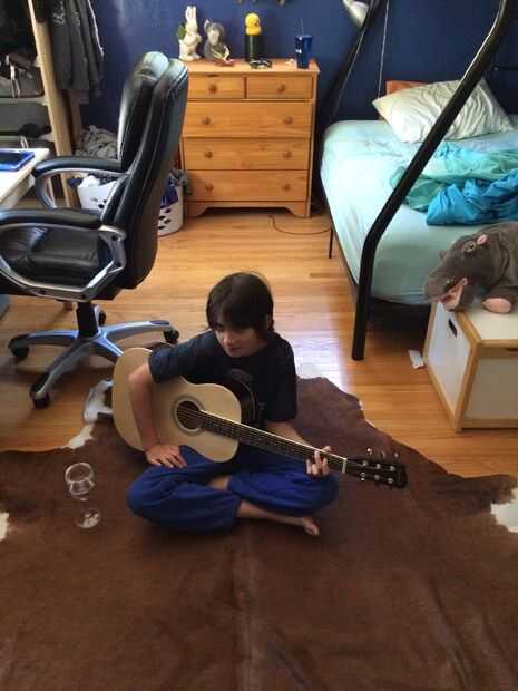 Mi hijo le gusta sentarse en su alfombra de vaca y tocar su guitarra. Si él sigue creciendo su pelo habrá dominado el look "rock star".