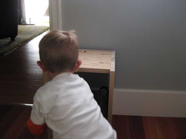 Una vez que se cortaron los trozos de madera, puse 1 caja para darme una idea del tamaño y profundidad. He intentado esto hacia fuera en el pasillo y mi ayudante quería llenarlo con zapatos de inmediato.
