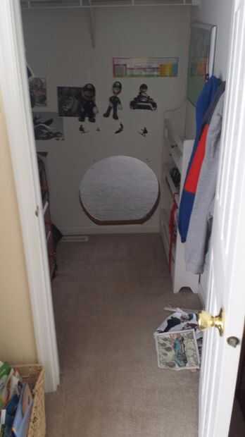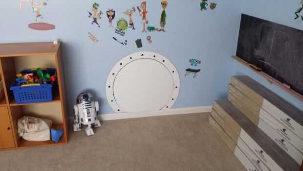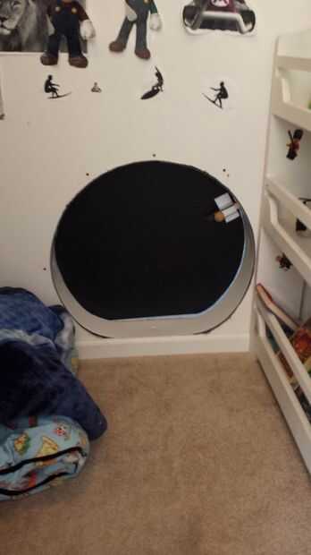 Después de que han decidido en su nuevo spot de ojo de buey. Medida en el otro lado para asegurarse de que no pegue nada importante. Ahora dibuja un círculo con el diámetro de su elección. Nuestro es de aproximadamente 2 pies de diámetro y aplana justo por encima de la placa base trim. En caso tenga que cubrir este agujero algún día. No quiero reparación de zócalos y paneles de yeso.