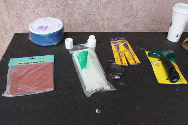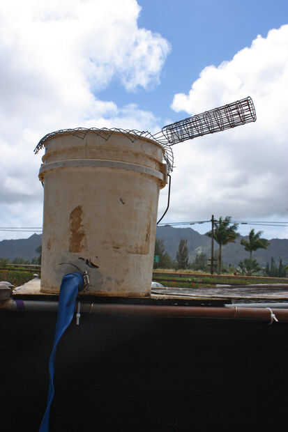 Nos compactarse la bañera, tubos, alambre de pollo, cubo y red del armario de almacenamiento, aunque todo puede comprarse en la ferretería de barrio grande-caja. Terminamos gastando aproximadamente $40 en algunos accesorios de PVC y una piscina de drenaje manguera, una cabeza de regadera y unas abrazaderas de plástico.