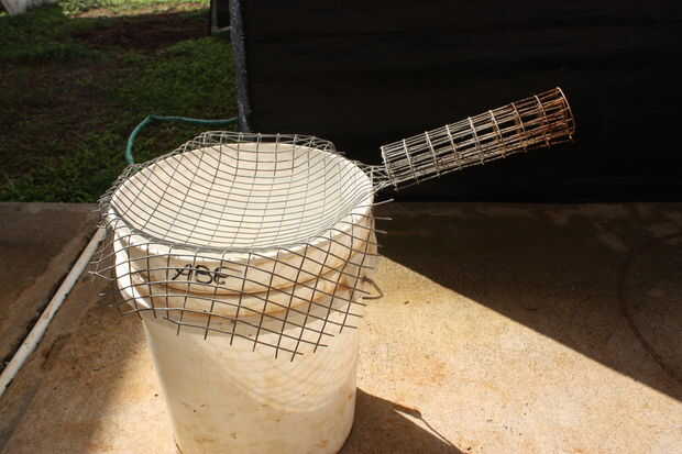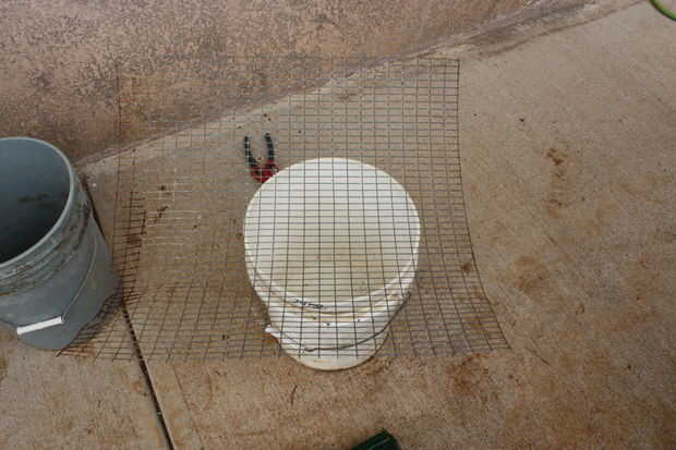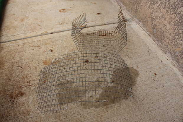 Cortamos el alambre de pollo en la forma que se muestra en la tercera imagen abajo, la sección cuadrada del balanceo hasta crear una manija sólida sin curvas cables asomando. Luego coloca la sección redondeada sobre el cubo y agachó su centro en el cubo. Esto puede hacerse fácilmente por caminar en el centro del alambre de pollo ya que descansa sobre el cubo.