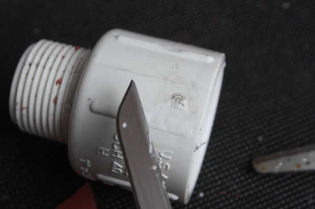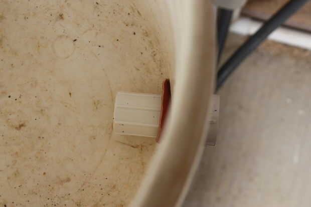 Entonces hemos perforado un agujero en la parte inferior de la cuchara, usando la Sierra de agujero de tamaño adecuado para nuestro taladro. Hemos utilizado algunos accesorios de PVC para crear un pezón en la parte inferior de la canastilla, a la que nos fija la manguera de desagüe. Recomiendo masilla o silicona sellante sobre la hoja de goma que utilizamos, que escape un poco.