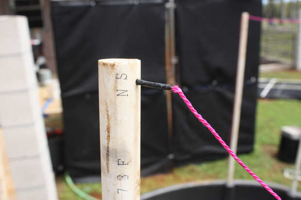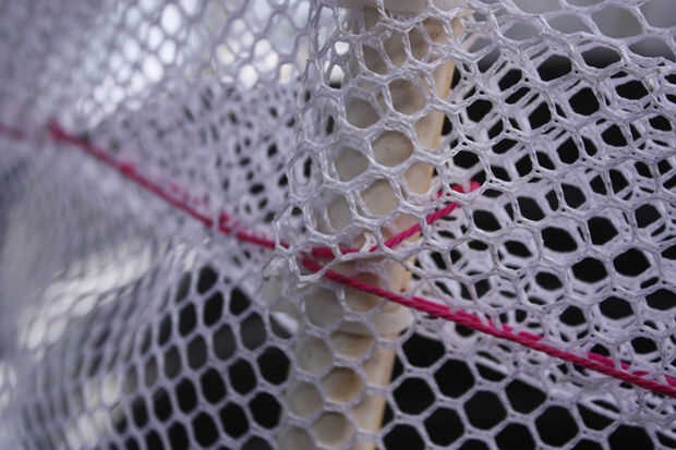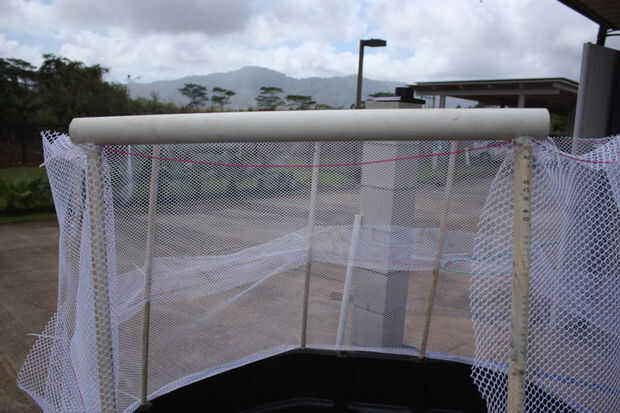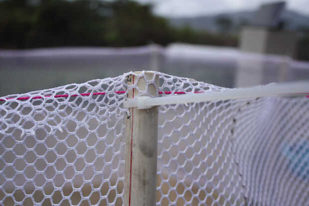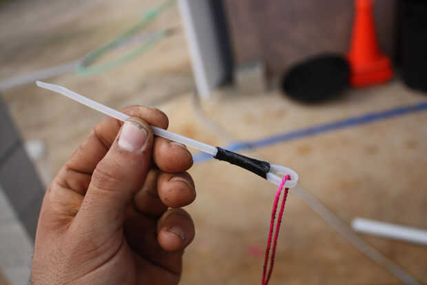 Nos zip atado nuestra red a los tubos y cuerdas, dejando un espacio entre los extremos de la red, que se convertiría en nuestro portal. Nuestro rollo de malla no era alto, así que utilizamos dos piezas. He utilizado un pice de chatarra de amarra como una aguja para "coser" la red juntos donde los dos pedazos de superposición.