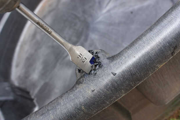 Se utilizó tubería de 3/4". No necesitas hacer ninguna matemática para averiguar qué tamaño de broca a utilizar, sólo traer un trocito de su tubo con usted a la tienda de hardware y elegir la broca es apenas más pequeño que el diámetro exterior del tubo. Encontramos que un poco de 13/16 Avos de pulgada era el tamaño adecuado para nuestros propósitos.