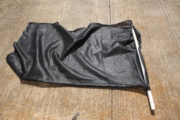 Para terminar la entrada, utiliza un tubo de diámetro más grande y cortar un agujero en cada extremo, fijándola como una viga transversal sobre los tubos verticales más finos. Nos y zip atado algún paño de nylon (a menudo vendido como paño de maleza en la sección de jardín) a la viga cruzada. Hemos añadido otro tubo en el extremo libre de la puerta, que sirve como un peso para mantenerlo cerrado.