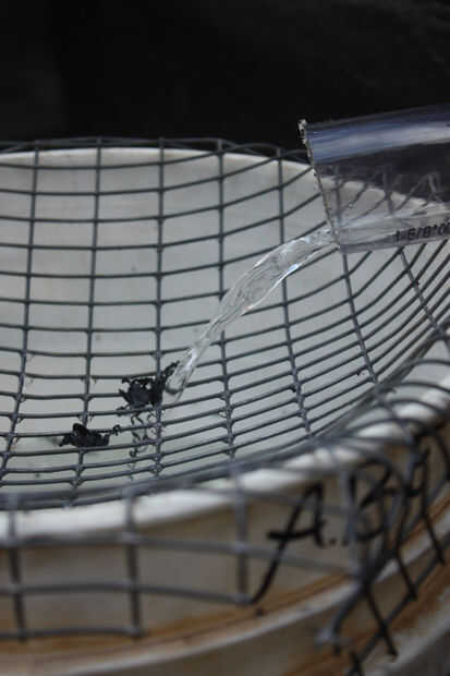 Abra la manguera y deje que el llenado de la bañera. Ajustar el flujo de la regadera se desborda la cabeza hasta que se ha llenado con la suficiente rapidez para que el agua drenando a tirar residuos en la superficie, pero no tan rápidamente que su cubo de filtro. Hemos añadido unos ladrillos en la parte delantera de la bañera, se incline hacia el desagüe.