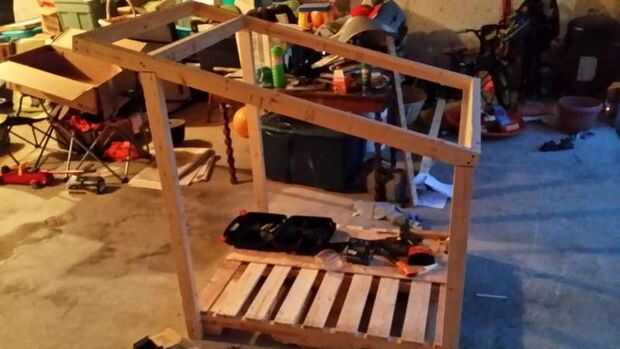 Añadir 4 secciones de 3 pies 2 x 4 para acabar la estructura del techo. Tapado los extremos de la línea de techo y usando 2 como centro admite a cualquiera Coloque su lata de techos o solado si utiliza tejas.