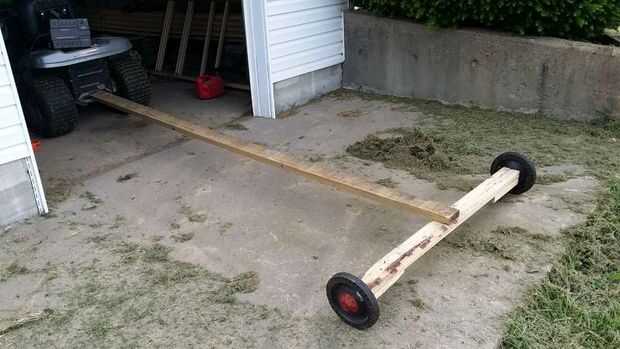 El trailer es casi demasiado fácil de describir. Las ruedas del carro son algunos antiguos 8 diametro ruedas (con tapacubos retros) para un árbol de media pulgada. Tomé uno de la granja y el hogar para obtener 2 tirafondos para hacer un eje que se deslice fácilmente por debajo el tonel. Después de llegar en casa, cogí el 6 pies 2 x 4 y un 10 pies 2 x 4 que había en la tienda y atornillada utilizando una Junta de traslapo en forma de T se montaron 2 bloques de largo 2 x 4 a cada extremo de los pies 6 2 x 4 de 6 pulgadas. Yo taladrar agujeros piloto de 3/8 pulgadas desliza una rueda sobre el tirafondo y había atornillado al eje. He dejado lo suficientemente flojo como para permitir que la rueda gire. Luego he añadido un tornillo de la cubierta que tenía en mi caja de herramientas como el perno del remolque.