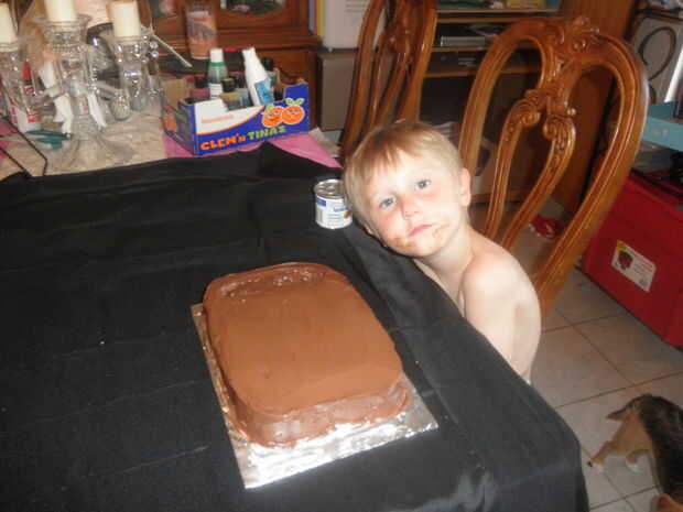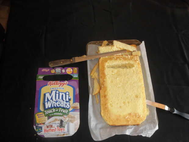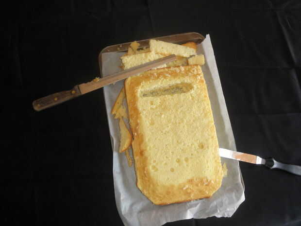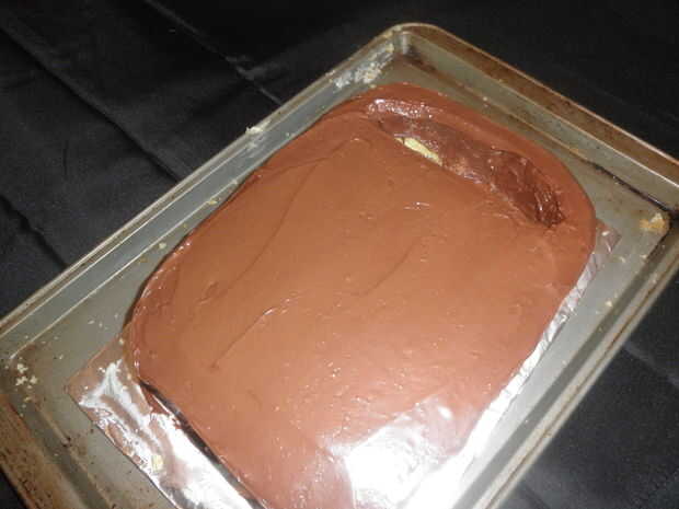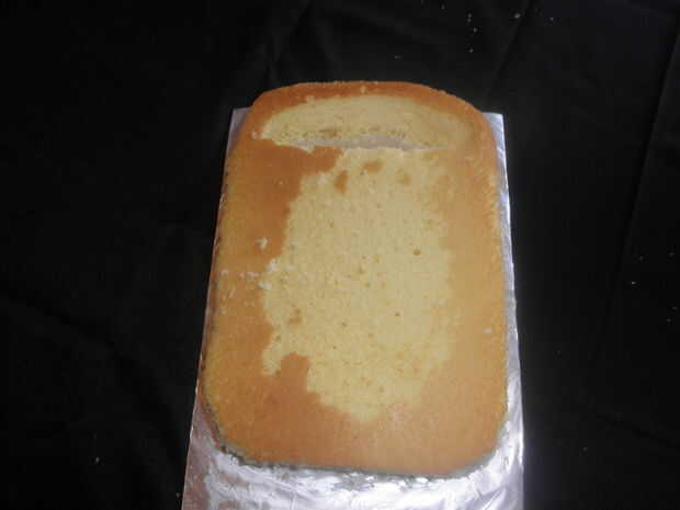 Primero cueza al horno su pastel favorito en una bandeja de 13 x 9. Deje que se enfríe. Después de unos 20 minutos de tiempo de enfriamiento puede ponerlo en el congelador, por lo que será más fácil de tallar. Mientras tanto dibujar una plantilla de la forma del habla y el hechizo en un papel o cartón me gusta usar cajas de cereal vacías. Luego recórtalo. Esto es sólo una guía cuando se trata de él, usted será eyeball y asegúrese de que se ve bien. Saque el pastel de congelador y utilice un cuchillo de sierra para "rastrear" tu pastel. Una vez que la forma básica puede empezar a asegurarse de que tiene los bordes rectos donde necesita los bordes rectos y bien, usted consigue la idea, solo limpiar un poco. Recuerde siempre... siempre puede sacar un poco pastel pero es difícil poner en ajuste así un poco a la vez.