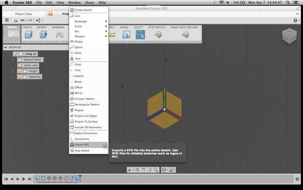 Ahora, iniciar un bosquejo, escoger un avión y seleccione la opción de importación de SVG en el menú dibujo. Haga clic en un archivo y especificar la posición inicial de la trayectoria SVG.