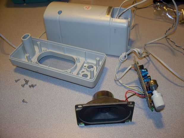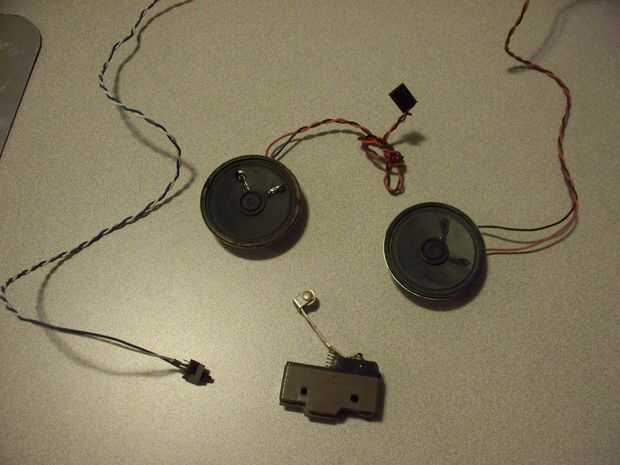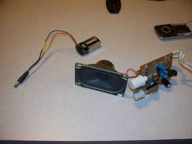 Para los altavoces, he probado usando un altavoz caso de PC en la toma de auriculares pero era demasiado tranquilo. En cambio, recuperado las piezas aprovechables un conjunto de altavoces con alimentación de la PC que funcionaba con corriente de 9V. Se utilizó el altavoz, el amplificador, cable de 3,5 mm y la cola de cerdo del adaptador de AC. Usé conectores de presión para el corte de sección del adaptador de CA a una cola de cerdo de batería de 9V para la alimentación. Esto proporcionó un montón de energía para hacer el altavoz lo suficientemente alto.