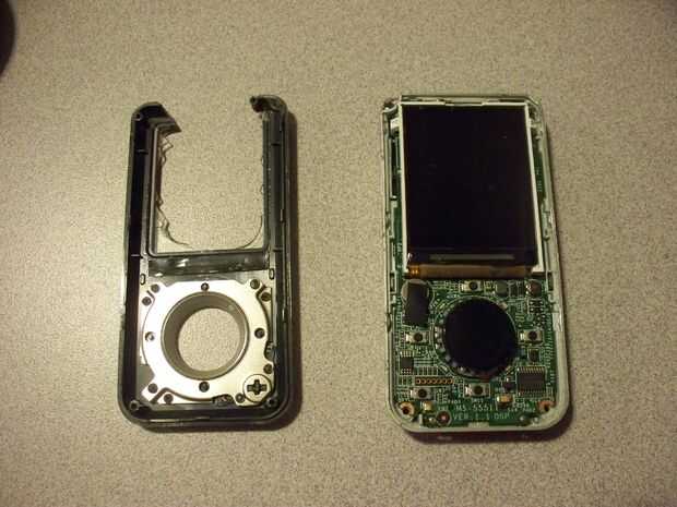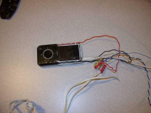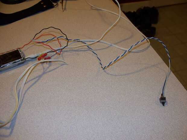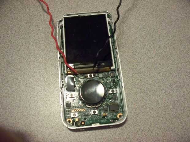 He desmontado el reproductor de MP3 y soldar los cables en el botón play. Esto tomó mucho más tiempo de lo debido. El botón es un microinterruptor y se dejó caer por debajo de la lanzadera de la sacudida y el cable flexible de la pantalla. No hay mucho espacio para trabajar.