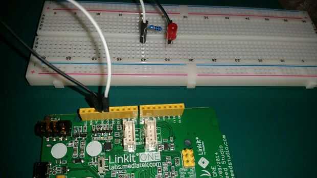 Tome extremo flotante del primer puente de alambre (el alambre conectado a la pata de la resistencia) y enchúfelo en la Junta uno de LinkIt en el orificio marcado D13.