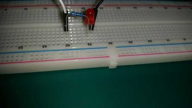 Introduzca un extremo de la resistencia (no importa cual) en la misma fila que la pata positiva (larga) del LED. Inserte el otro extremo en una columna vacía.