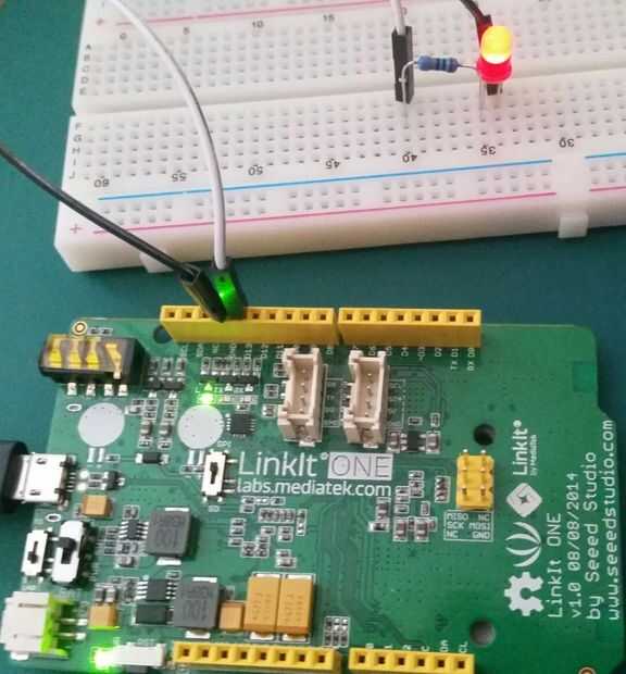 Nunca omitir la resistencia del circuito. La resistencia detiene el LED dibujo demasiado corriente que pueden dañar permanentemente el uno de LinkIt.