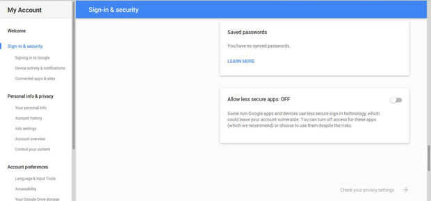 Para activar gmail relacionadas con características en el dispositivo, inicie una sesión en tu cuenta de gmail de su navegador haga clic en "mi cuenta"->"Inicio de sesión y seguridad" y desplácese hacia abajo hasta encontrar la opción "permitir aplicaciones menos seguros: off" y luego la cambiar a "on"