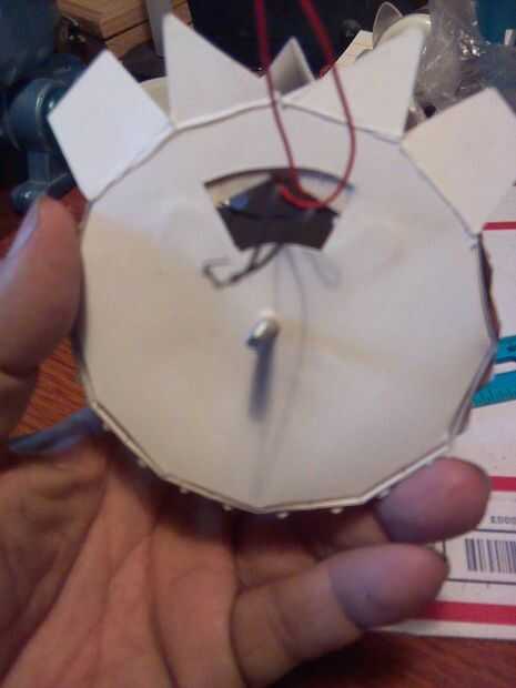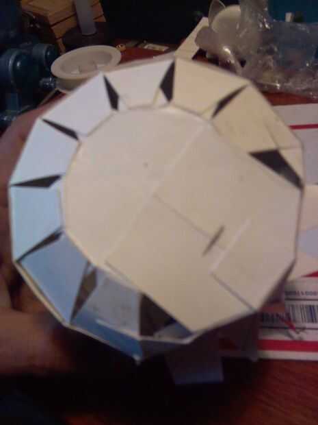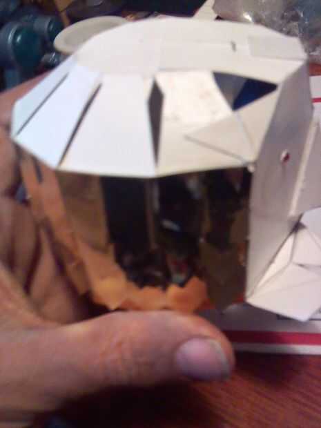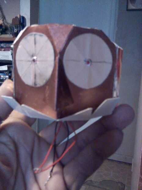 La cabeza completa. La primera foto muestra la lámina de metal "plumas" pegados a él. Pinté el bronce de cara con pintura acrílica. Y los ojos de LED se han instalado en la cabeza. Lámina más "Plumas" a encolar para completar la cabeza.
