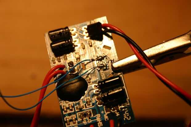 Quite el interruptor del botón "play" y soldar cables de abrigo a los rastros. Esta es la parte más difícil del proyecto.