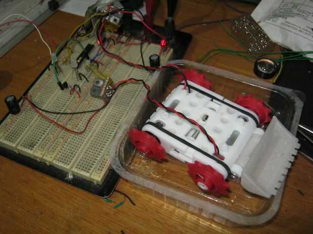 He hecho el circuito en un protoboard, también se insertan los cables procedentes de los motores a la Junta. Por lo tanto fue incapaz de moverse durante algún tiempo. Después de que el código tomó forma y las cosas comenzaron a hablar y moverse, he trasladado el circuito a un tablero más pequeño e instalado una batería de ion-litio para hacerla moverse libremente. Me permiten un Consejo Permanente para colocar dentro de la torreta junto con una batería más pequeña más adelante.