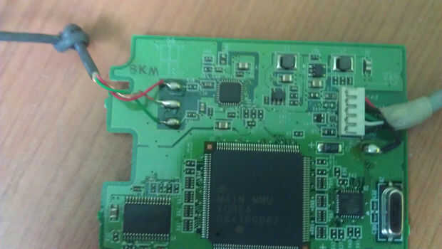 A la izquierda de la Junta habrá 3 conectores. Rojo, cobre y verde, solo les importa rojo un cobre porque es para el azul led verde en el micrófono que no necesitamos. Debemos soldar el cable a tierra del cable al cable de cobre del pero asegúrese de que todavía se suelda en el tablero. Ahora necesitamos hacer lo mismo con el otro cable del cable y el cable rojo del micrófono.