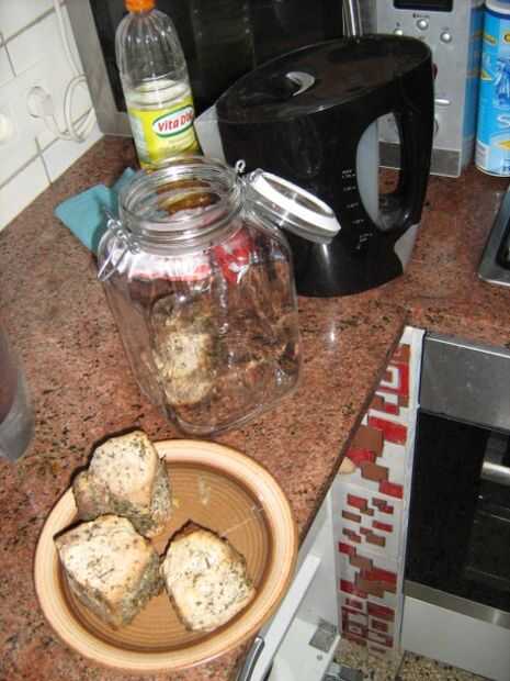 Espere hasta que la carne esté fría, colocarla en el frasco recién esterilizado y la cubierta en aceite de oliva.
