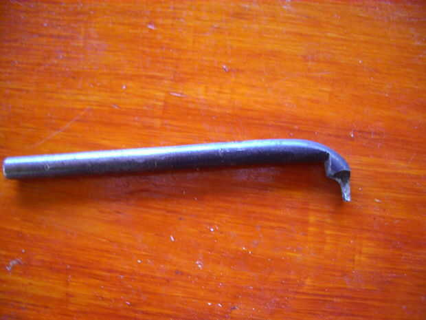 Busqué entre mis cosas un trozo de varilla acerada de 5 mm de diámetro, le gasté un lado para proveer un lugar para sujetarla en posición, y luego, calentándola en la hornalla de la cocina un recto gas doblé un extremo en ángulo, aproximadamente 1/2 pulgada. Un extremo de ese lo afilé y le di forma de uña.