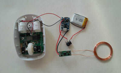 Cuando bobinas de receptor y transmisor se están acercando, módulo de cargador de LiPo enciende LED rojo. Se puede ver el LED azul cuando la batería está llena.