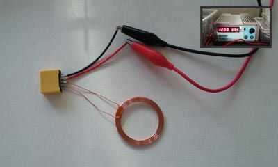 Y he probado si carga inalámbrica piezas funciona bien o no. Sobre el cuadro es transmisor de carga inductiva. Que esta conectado a fuente de alimentación con 12V de ajuste.