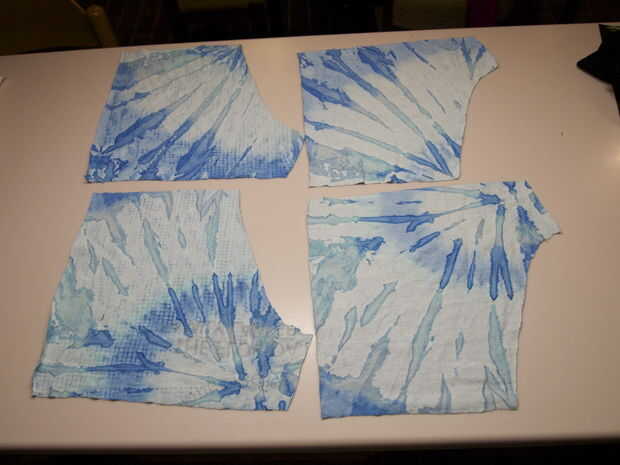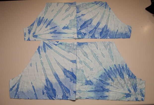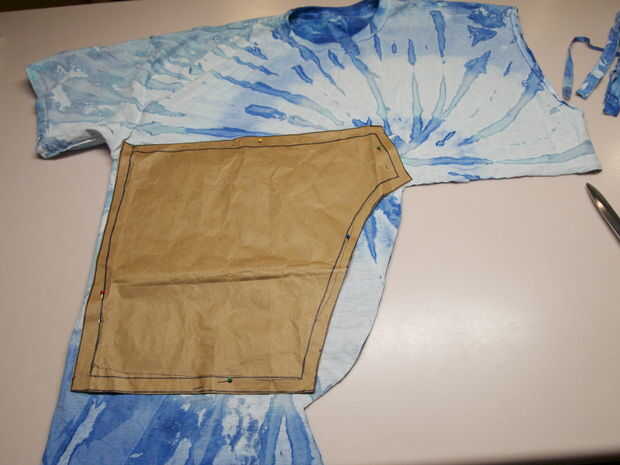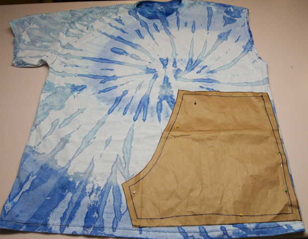 Tomar su camisa y poner sobre una superficie plana. Si hay un logo en la camiseta, vuelta adentro hacia fuera. (Había un logotipo en mi camisa, pero era bastante delgado, y que no afecta a la comodidad de los pantalones cortos). Poner el patrón de la camisa. Asegúrese de que hay suficiente espacio en la camiseta de dos de sus patrones, porque vas a necesitar cuatro paneles. También, si hay un patrón en su camiseta (como por ejemplo, el Tie-Dye en la mía), intentar poner tu pieza en una parte del diseño que más te guste. En el patrón del perno y recortarlo. Repetir una vez. Ahora, debe tener cuatro paneles idénticos.