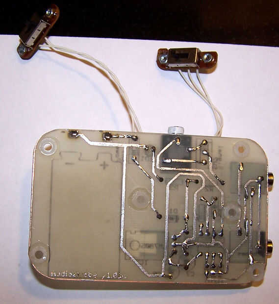 Las resistencias y las tapas de cerámica pueden ser orientados de cualquier manera. Enganche los cables cortos y doblar a lo largo de sus rastros en la parte posterior. Si ve la foto de la parte posterior del tablero a tamaño completo, usted puede hacer hacia fuera que conduce el doblado. Tenga cuidado de no superar alguno de los cables. Asegúrese de que antes de que la soldadura que los conectores de audio son al ras con el tablero. Si está levantadas en todo, van a estar mucho menos robustas como es enchufar en ellos. Además, será un dolor para perforar agujeros de montaje para. Distancia de la soldadura. Flujo es tu amigo. Hasta el momento para limpiar el tablero, cuando empiezas a odiar con pasión.