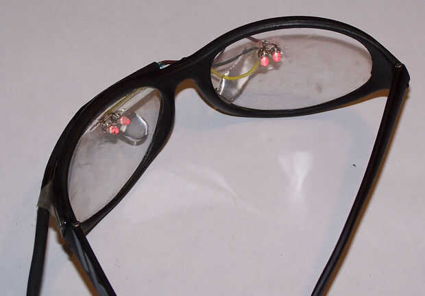 Ya señalé que son gafas de solo canal, no aprovechando que cosita el interruptor de alta tecnología tenemos instalado en nuestra unidad de decodificador. Solamente un conjunto de LEDs. Y solo dos LED por el ojo, justo al lado del otro. Cuando se experimenta con el circuito breadboarded, revisé para ver si dos LEDs sería suficientes para ver a través de los ojos cerrados. Eran. No fue sino hasta después de que había construido las gafas me di cuenta de que dos LEDs fueron lo suficientemente brillante si enfrentaban mis retinas y mi retinas fueron frente a ellos. Cambiar el ángulo de cualquiera, sin embargo un poco, y todo lo que tienes es una leve sugerencia de luz. Mi próximo par de gafas va a tener por lo menos tres LEDs por línea para cada ojo, espaciado cerca de tres cuartos de pulgada aparte, en un patrón de estrella (bueno, triangular, pero si hay dos líneas...)