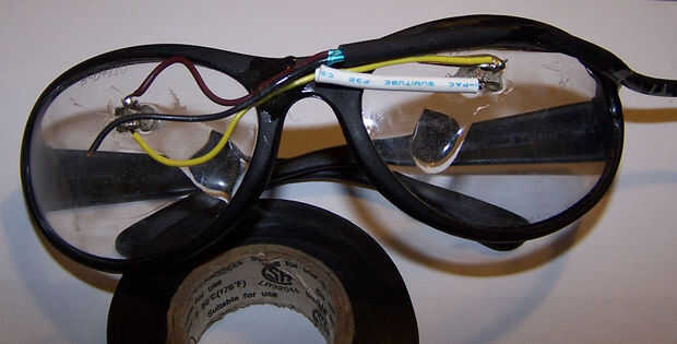 Sólo usé los cables de LED para conectar entre sí, como se puede ver en la primera foto Utilicé un trozo de alambre para conectar los cátodos del ojo derecho a los ánodos de la izquierda. El cable de tierra se encajona en un muy mal pedazo de tubo termo-retráctil. El cable se ajustaron a la parte delantera de las gafas; la conexión se interrumpe en la bisagra de la madre. Se puede ver cable de señal del canal no utilizados totalmente ondeando en el viento. Si yo no ajustaron los LEDs, pude volver e instalar otro canal, pero con mis problemas de colocación de LED, sólo quisiera construir un nuevo par de cero.